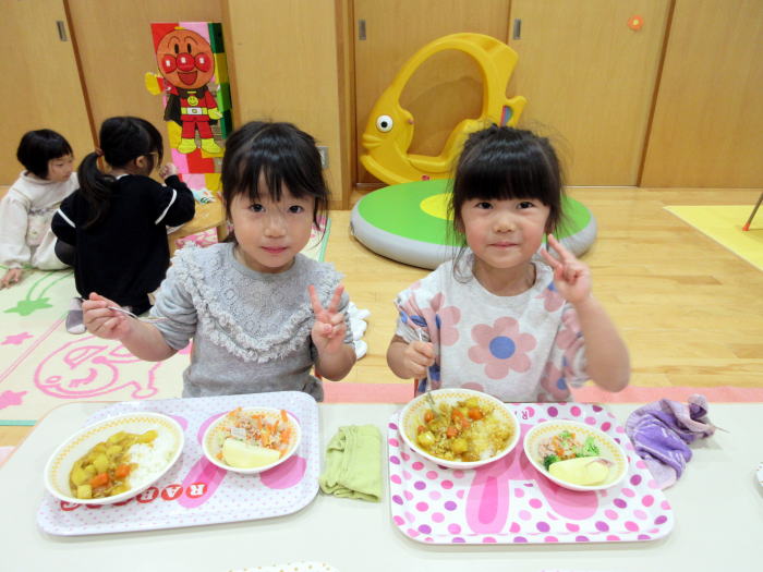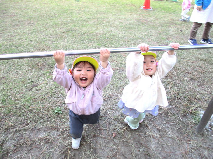背が伸びて鉄棒に届くようになったよ!「みてみて!」と嬉しそうにお友達と並んでいます。
