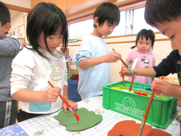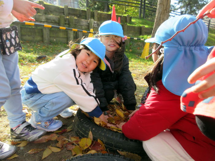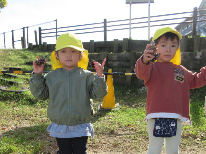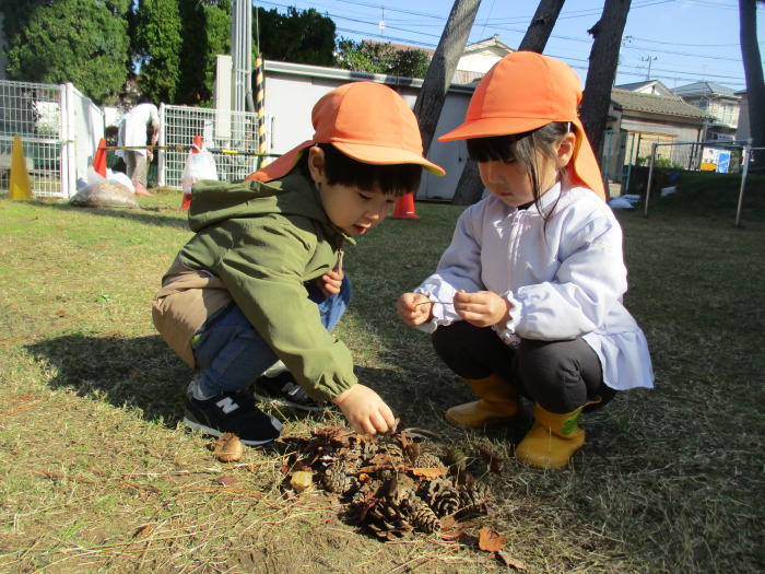 園庭では松ぼっくりや落ち葉を拾って、秋の自然を感じています。
