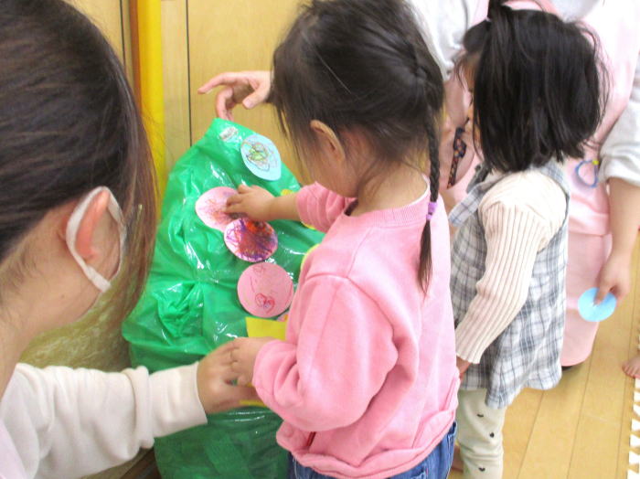 手作りクリスマスツリーに飾りつけをしました。クレヨンで模様を描きました。かわいいツリーになりました!