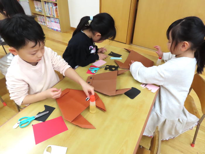 来年の干支の馬を、画用紙を折って作りました。目や鼻はハサミで好きな型で切って馬の完成です。