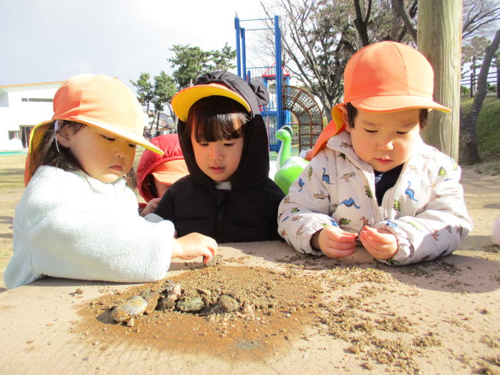 晴れた日は、コートを着て、園庭へ行きます!石や葉、砂を並べておやつパーティー中です!