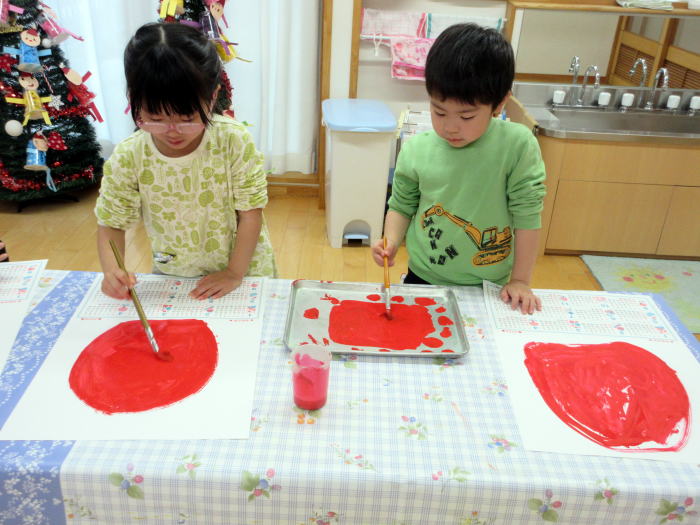 赤い絵の具で大きな丸を描いて、ぬりぬり…なにができあがるかな?