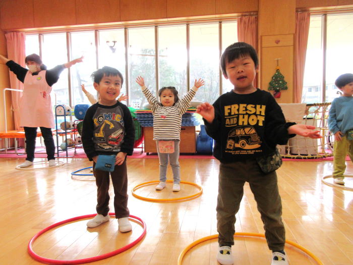 フラフープで体操遊び。