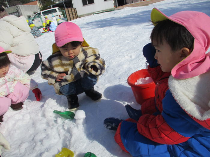 雪遊びをしたよ。「つめたーい!」と言いながらも楽しんでいます。