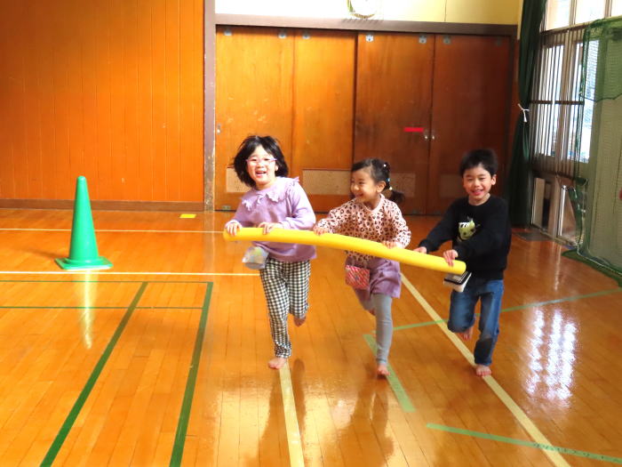 毎月楽しみにしている体操教室。「今日は何をするかな」と、友達と協力し、バトンリレーを楽しみました。