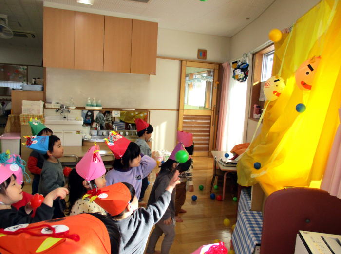 「鬼は外~、福は内~」と言いながらボールを投げて鬼退治をしました。