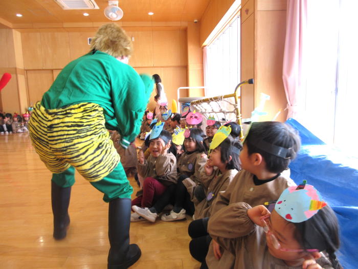 『節分楽しみ会』で、鬼の登場に「わぁ、こっちにきた!」と、ちょっぴり怖がる子ども達。でも”あれ?よく見ると知ってる先生に似てるな~”と気付き、なんだか嬉しそうでした。