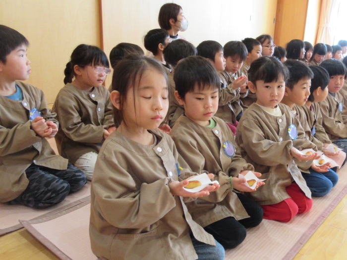 ゆり組さんの『抹茶の集い』を見学です。静かなお茶席に緊張しながらも、お菓子をいただいたり、ゆり組さんのかっこいい姿をよく見たりして楽しみました。