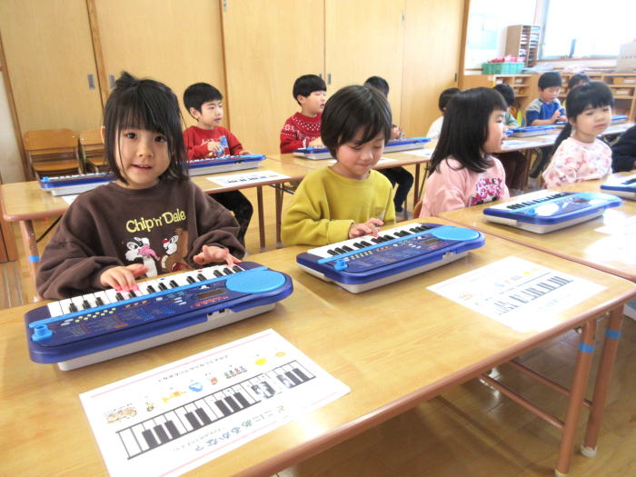 キーボード教室では、初めてスイッチを入れ、鍵盤を押して弾いてみました。「ドの音はここですよ」と教えてもらうと「あった。ここだね」とすぐに見つけて、みんなで一緒に弾いて、嬉しそうでした。